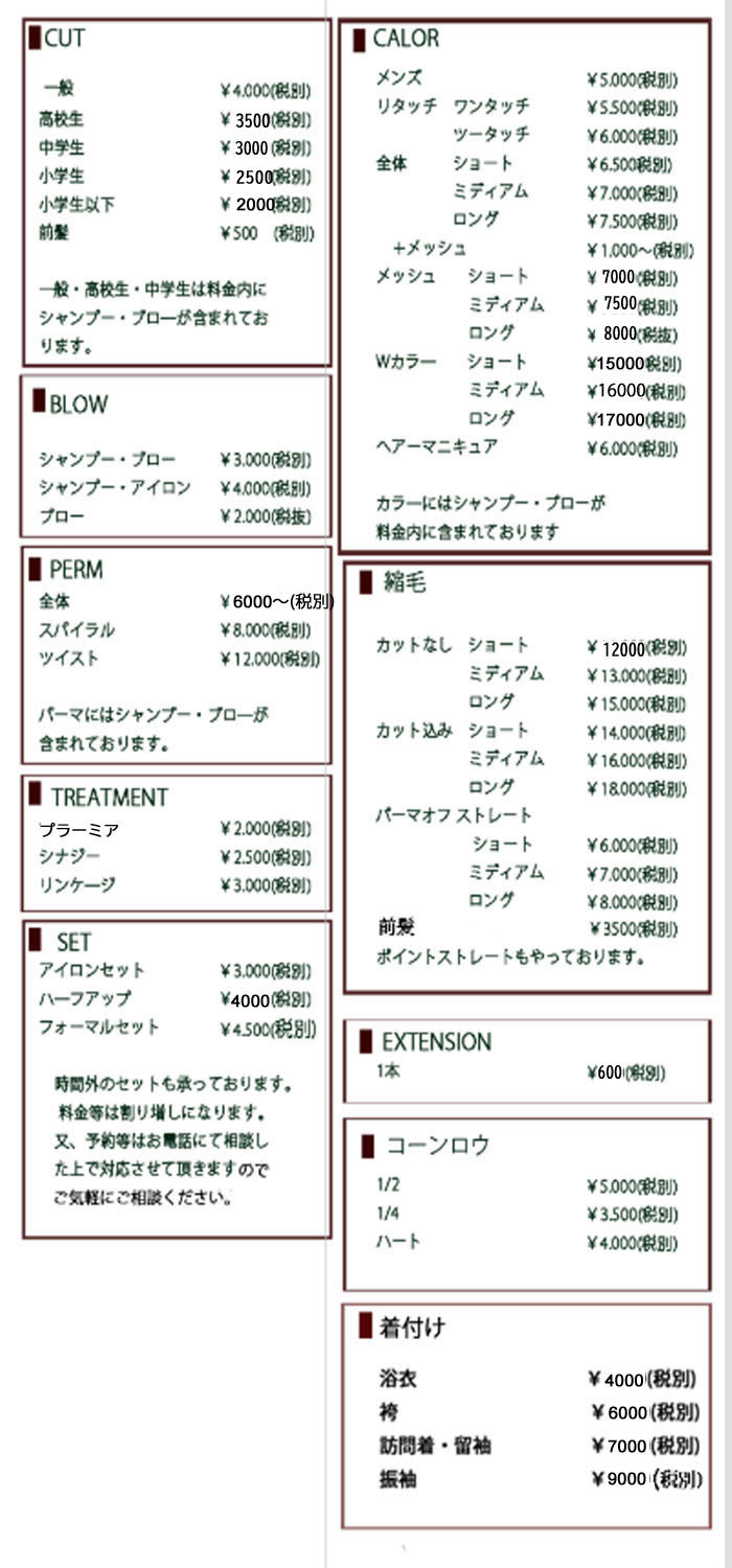 カット無し (S) \ 10000(税別) カット込み (S) \ 13000(税別)